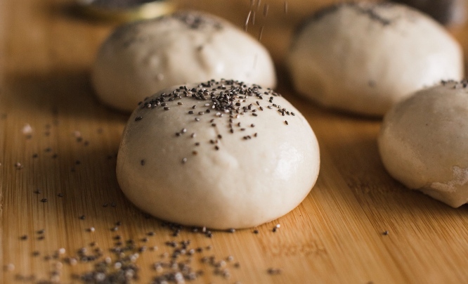 3. Расучете го тестото на дебелина од два сантиметра, па со чаша вадете форми на погачки. Ставете ги на плех обложен со хартија за печење, па премачкајте ги со мешавина од јајца и мајонез. По желба, посипете ги со семиња (ким, сусам).